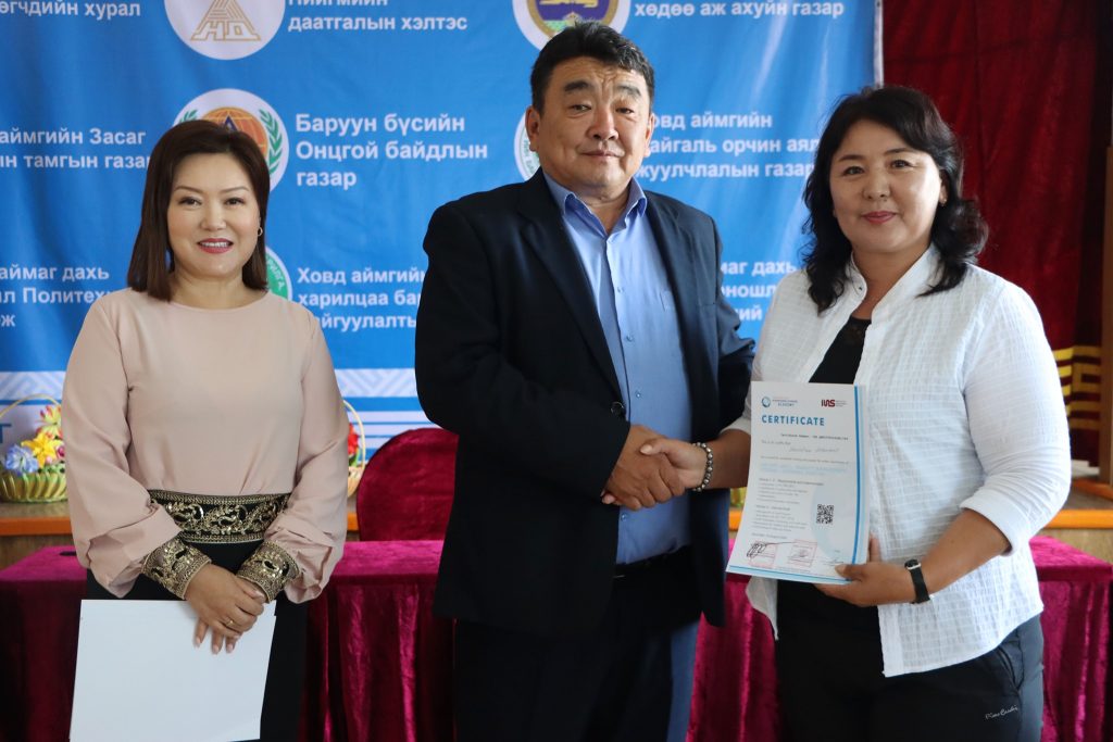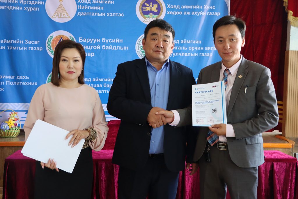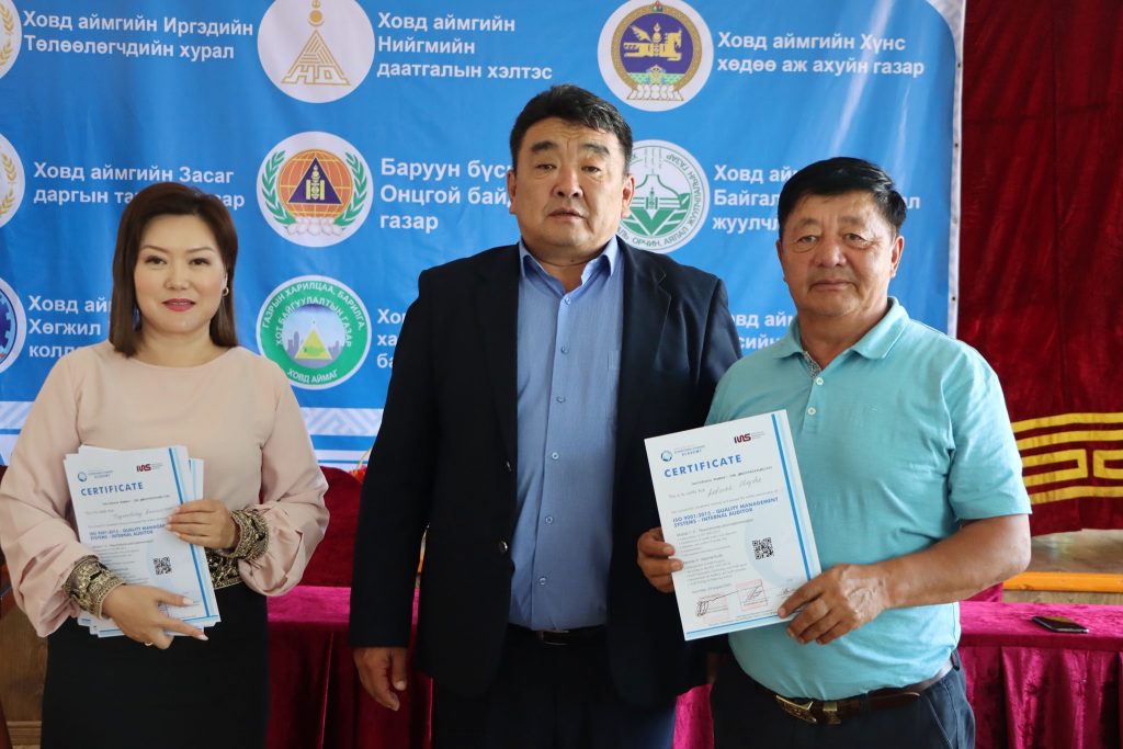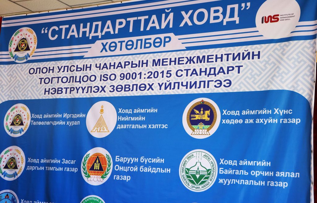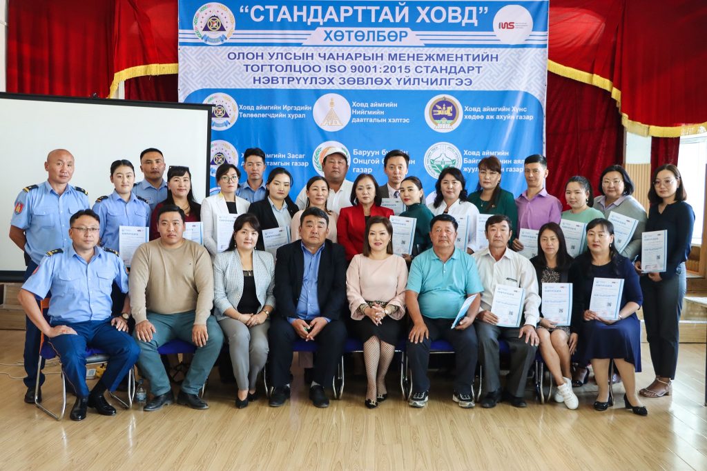 ISO 9001:2015 стандартыг Ховд аймгийн ЗДТГ нэвтрүүлж, 2019 оны 12 сард батламжаа гардан авсан бөгөөд цаашид төрийн захиргааны болон үйлчилгээний бүх байгууллагад нэвтрүүлэхээр ийнхүү зорьж ажиллаж байгаа юм.